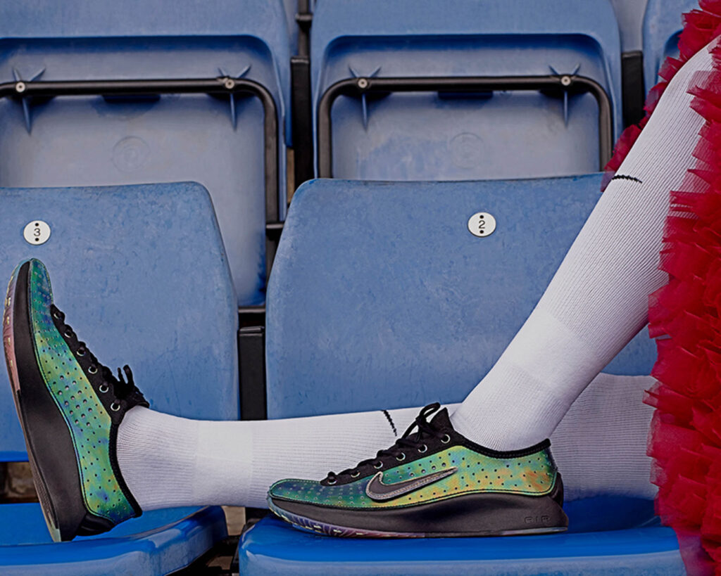 The design takes inspiration from Japanese manga and elite women athletes, resulting in a silhouette that embodies both power and femininity. The upper and tongue feature a lenticular material that shifts color in changing light, while a multicolor outsole incorporates green dots reminiscent of early 2000s track spikes. Three interchangeable Swooshes — including two ruffled versions — along with multiple lace options allow wearers to personalize both volume and style. Koizumi’s logo is placed on the sock liner, cementing the collaboration as a continuation of his artistic vision.