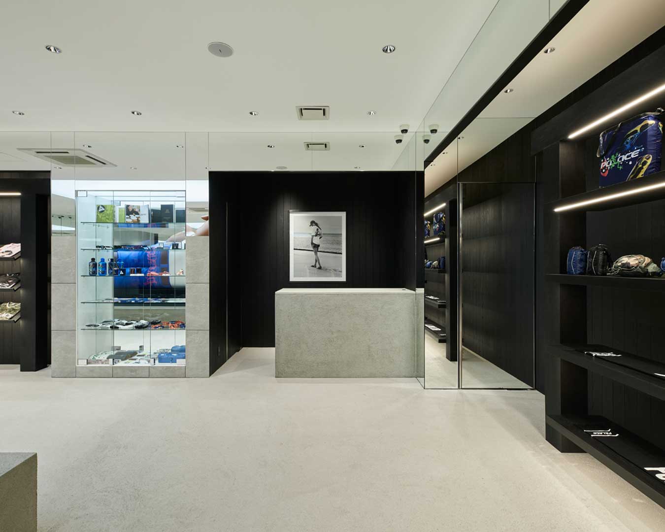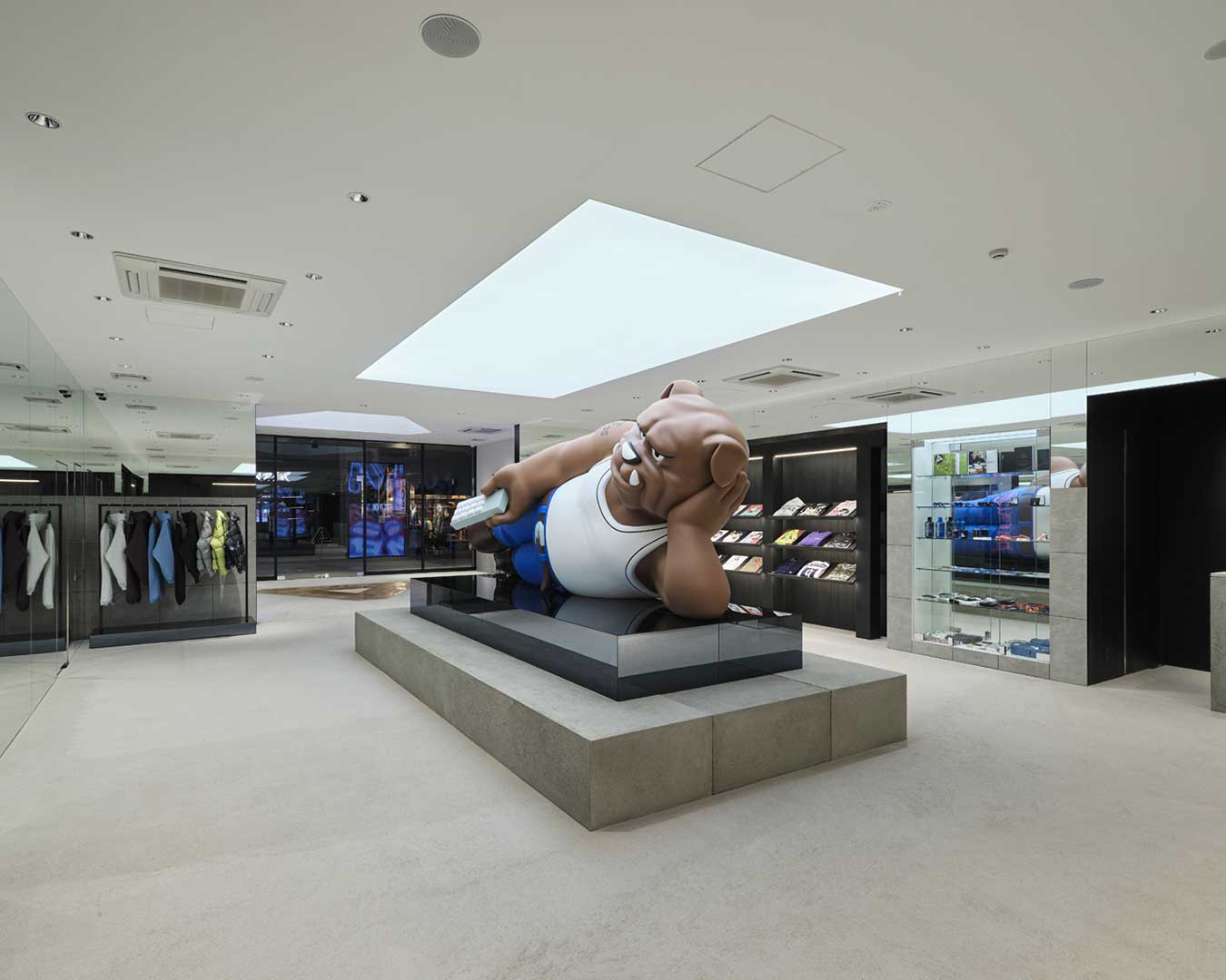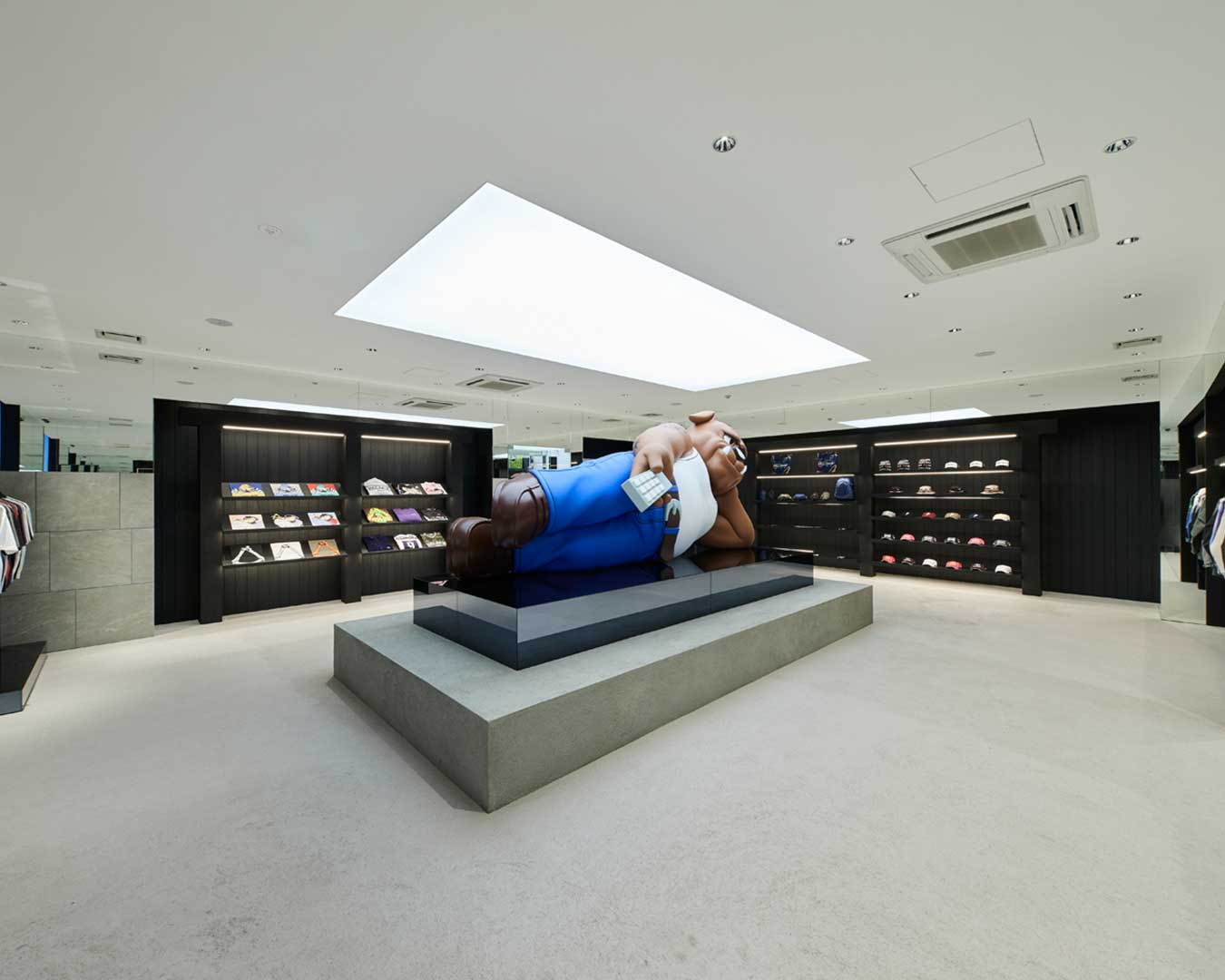 The store design was conceived by multidisciplinary designer Steve Oh, founder of OSTVO in Seoul’s Mapo district. Drawing inspiration from two Fukuoka landmarks—the ruins of Fukuoka Castle and the Great Reclining Buddha—the space reinterprets regional heritage through Palace’s lens. A glass façade outlined by a glowing Palace sign leads inside to a brass Triferg embedded in the floor, surrounded by rugged stone and dark wood evoking the castle ruins. A Triferg-shaped ceiling light and dual video walls guide visitors toward a monumental bulldog statue, reimagined from the Reclining Buddha and set within the same stone-and-wood framework. The result is a striking fusion of local history and Palace’s bold identity.