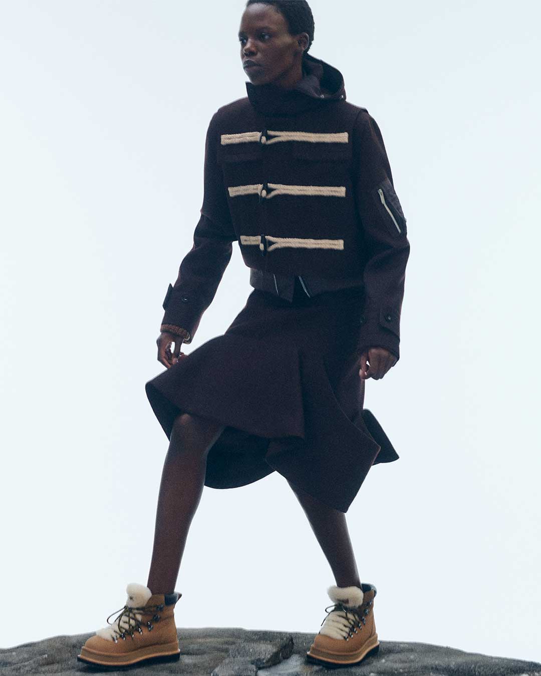 The campaign visualizes a dialogue between fashion and nature, shifting from the runway to rugged terrain. Models wearing Sacai’s Fall/Winter 2025 looks embody a spirit of freedom and experimentation, echoing the capsule’s theme—untamed, unrestricted, unconventional.