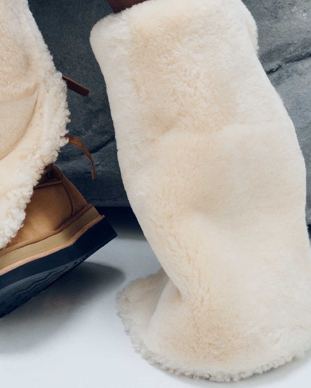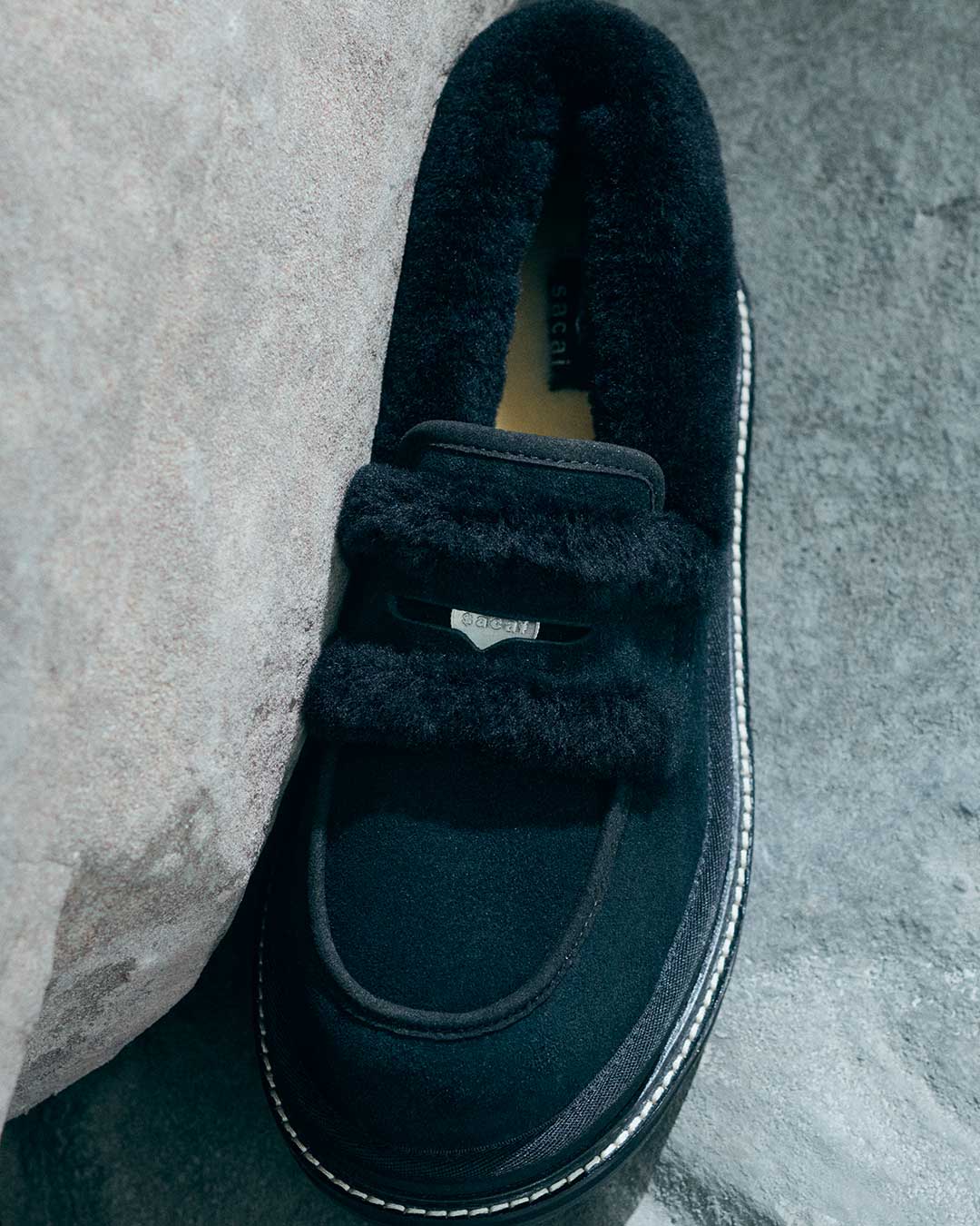 Designed by Chitose Abe, Sacai’s creative director, the collection transforms UGG’s timeless materials—soft suede and plush sheepskin—into elevated, architectural pieces. The UGG x Sacai Thigh High Boot, priced at ¥176,000 (tax included), appears in black and chestnut, featuring a back buckle detail that can be worn fastened or folded to reveal the lining. The UGG x Sacai Loafer, at ¥52,800 (tax included), delivers a bold yet refined update to a classic shape, while the UGG x Sacai Hiker blends comfort and utility in equal measure, each offered in both colorways.