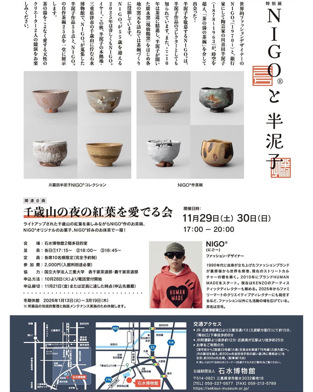 Nigo presents his first ceramics exhibition “Nigo and Handeishi” at Sekisui Museum, pairing his debut tea bowls with works by the late master potter Handeishi Kawakita in a cross-generational dialogue.