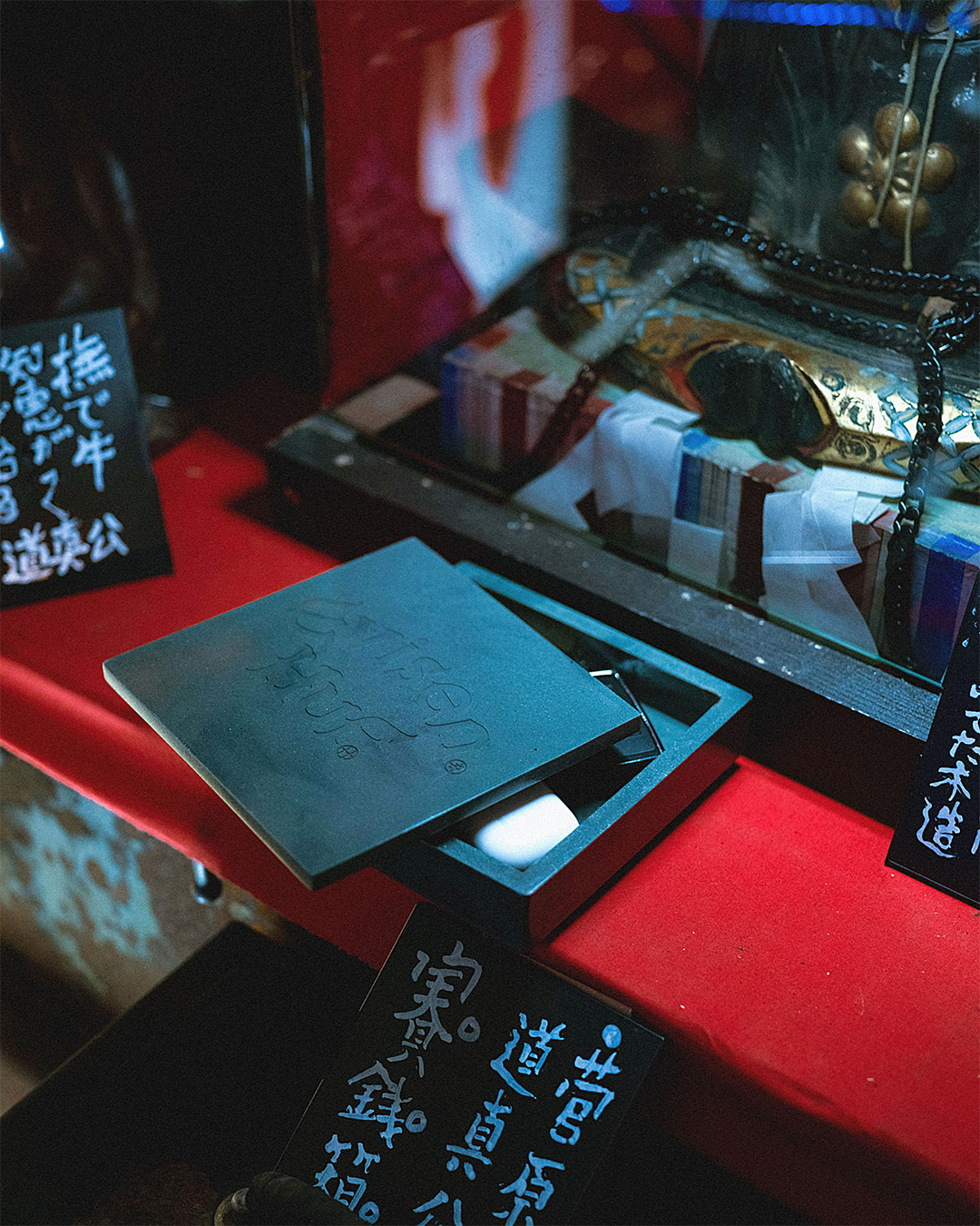 Across the range, familiar symbols tied to Japan’s visual language, including Mount Fuji and sushi, appear through embroidery, print applications, and other crafted techniques. The assortment spans apparel and objects: a stadium jacket, double-zip hoodie, crewneck fleece, beanie, sake bottle and cup set, plate, belt buckle, and a marble stash box. Each item reinforces the collaborative universe while giving space for Evisen’s humor and Huf’s California-born sensibility to intersect.