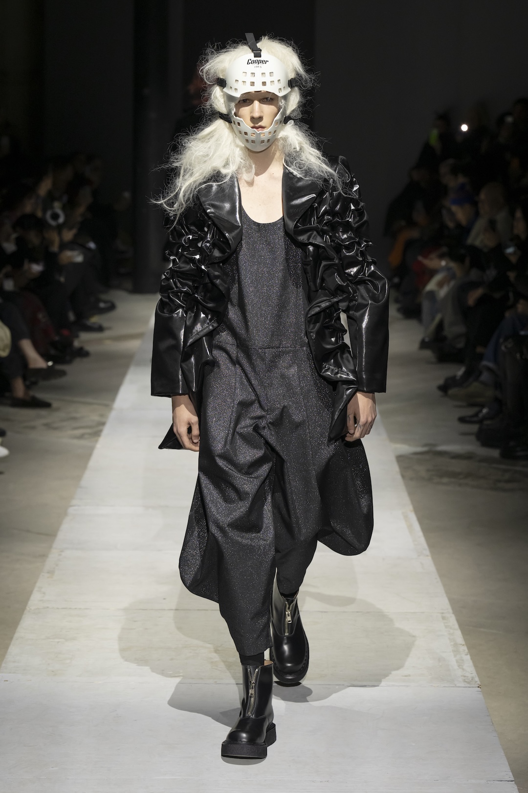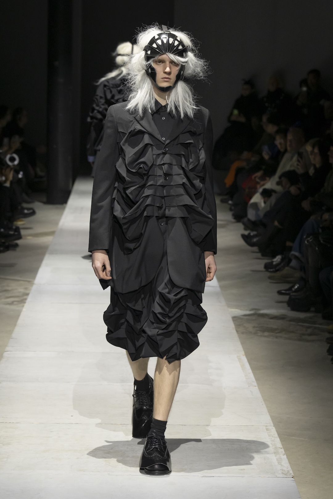 Presenting a monochromatic vision of resilience in Paris, Rei Kawakubo utilizes sculptural ruffles and protective headgear to symbolize a spiritual escape from darkness.