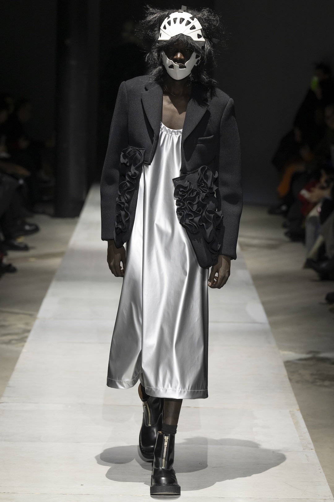The silhouettes reflect a struggle for light, characterized by avant-garde tailoring and dramatic textile manipulation. Intricate, sculptural ruffles bloom across the chests of dark blazers and coats, creating a sense of organic growth against austere backdrops. Monochromatic layering is central, featuring elongated white tunics paired with heavy black outerwear, and metallic, iridescent fabrics that suggest a shimmering exit from the void. These garments are complemented by radical headgear—artistic masks created by Shin Murayama—that resemble industrial or knightly visors, reinforcing the theme of a perilous journey through a psychological “black hole”.