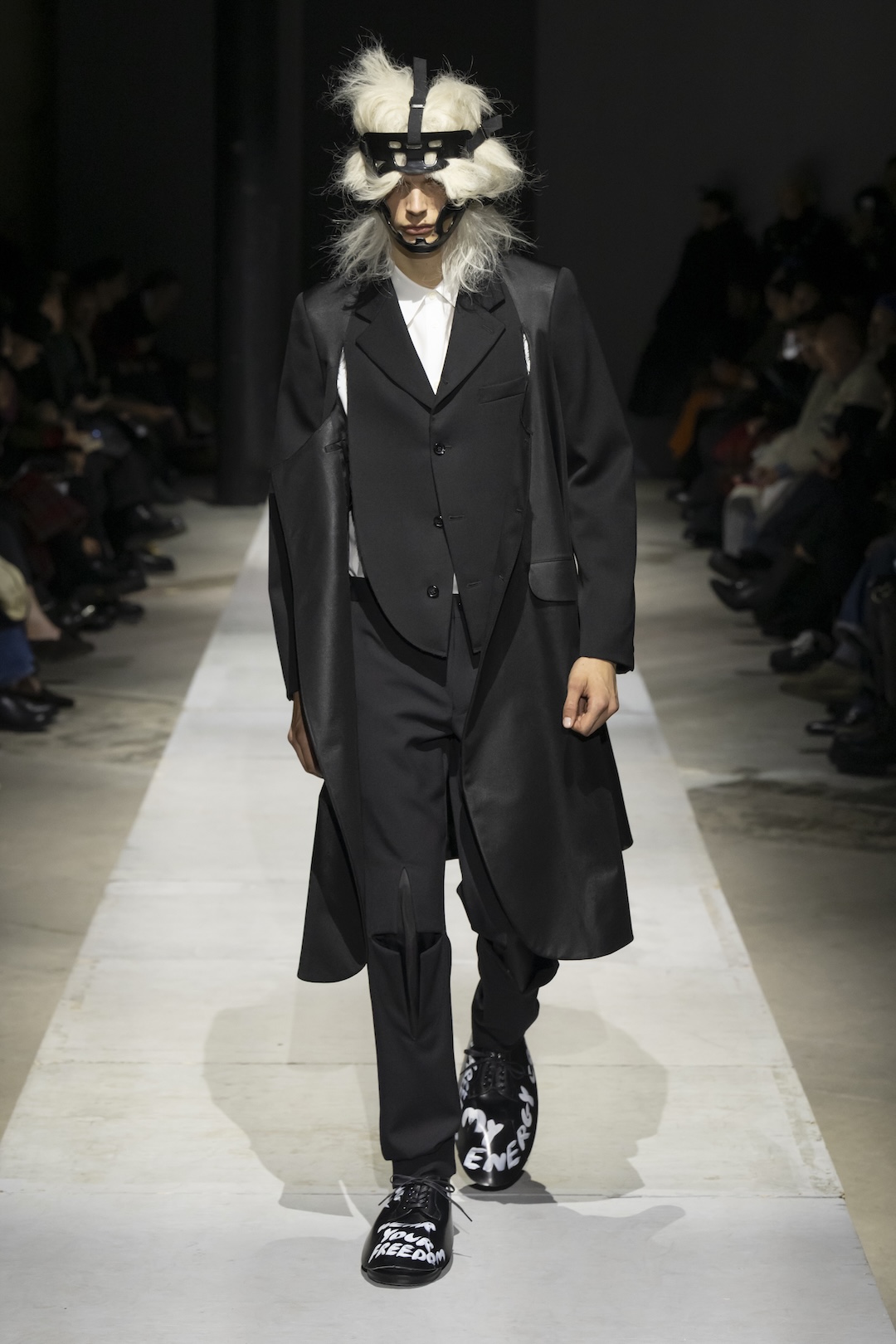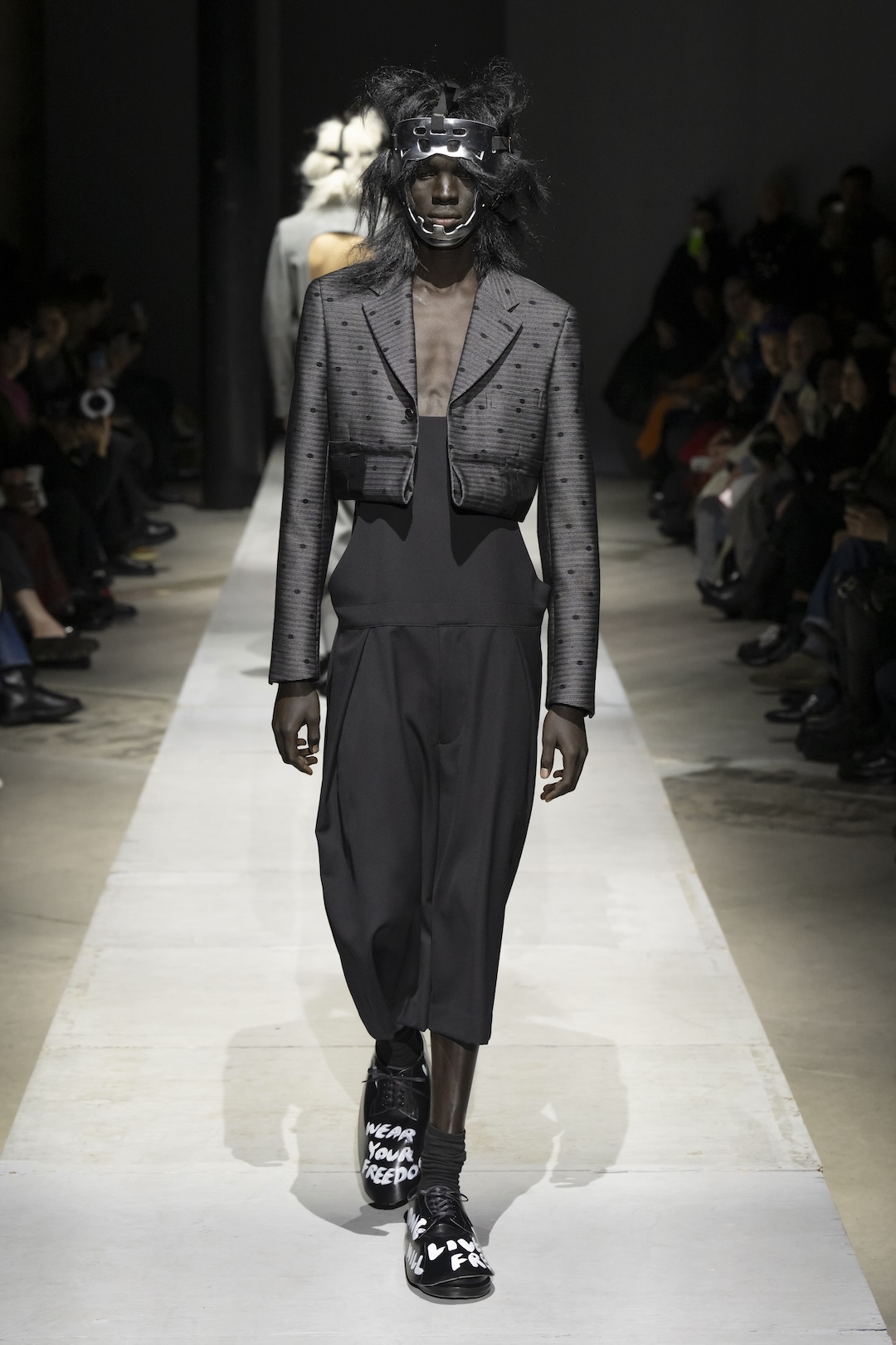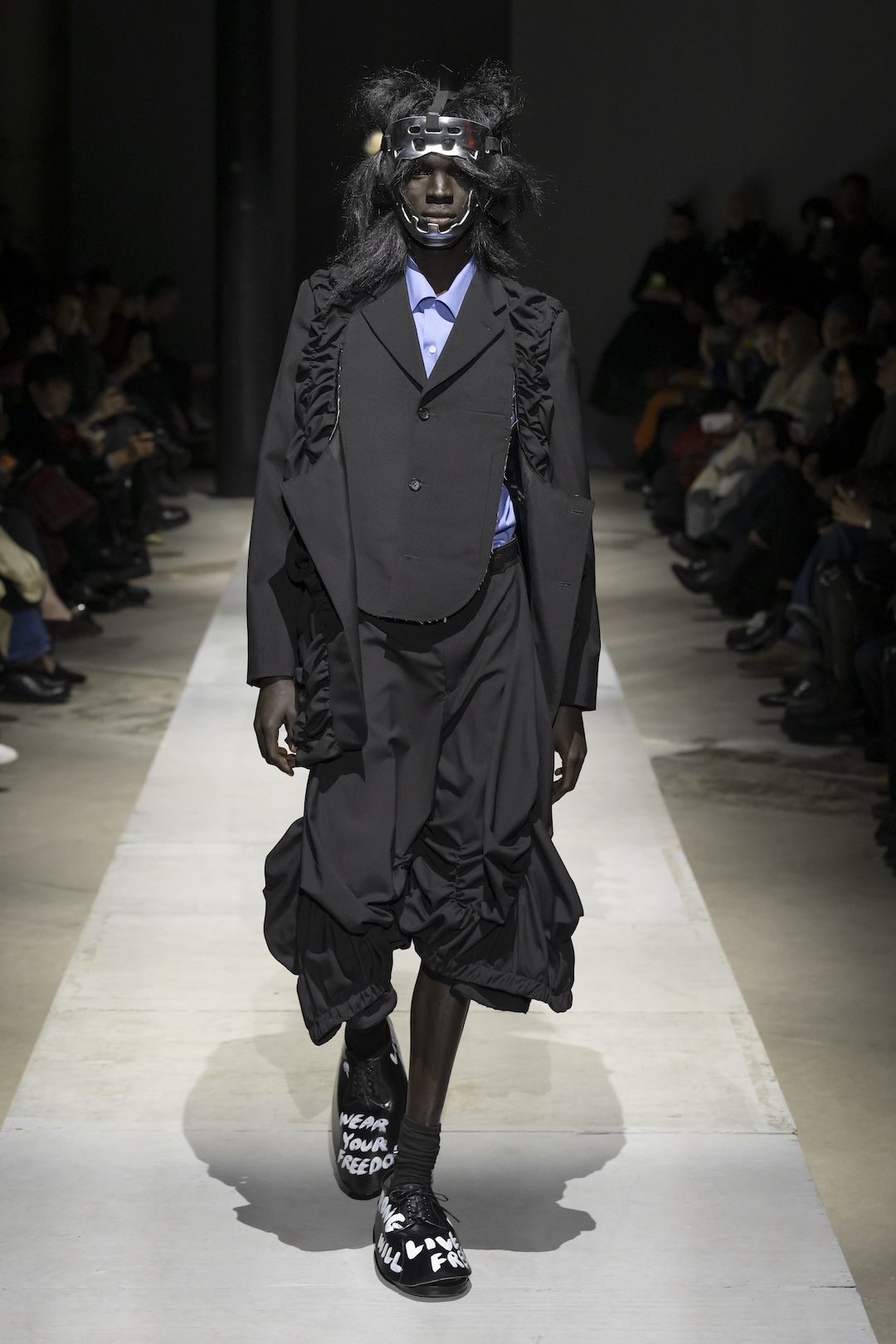 Footwear and collaborative projects ground the high-concept aesthetic in contemporary culture. The show highlighted a major collaboration with the Air Jordan 11, alongside specialized footwear developed with Kids Love Gaité. Several looks featured shoes scrawled with handwritten white text, such as “Live Free” and “My Energy,” serving as literal manifestos for the collection’s liberating philosophy. With hair and makeup by Takeo Arai, the presentation stood as a stark, poetic reminder of the strength required to transcend darkness.