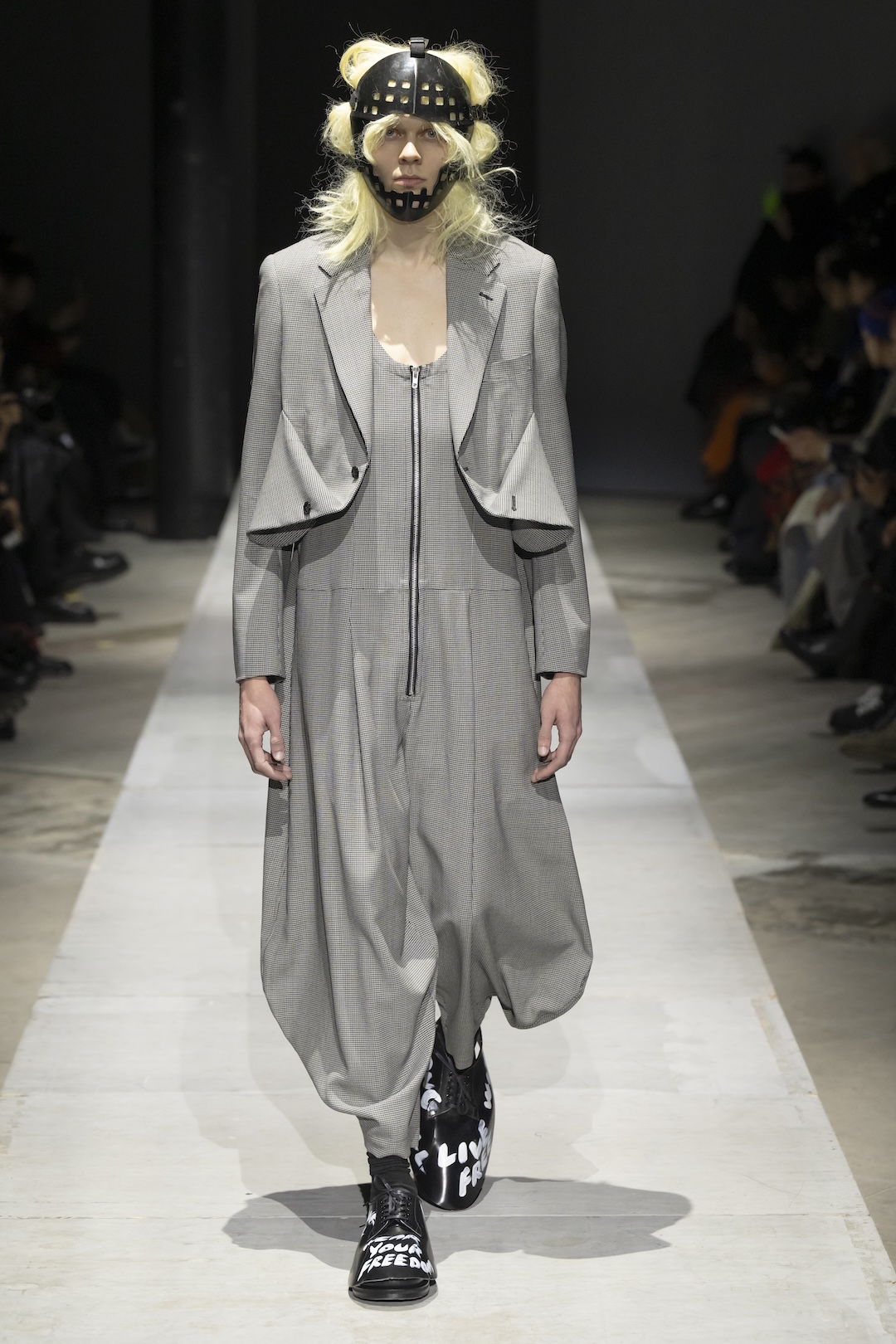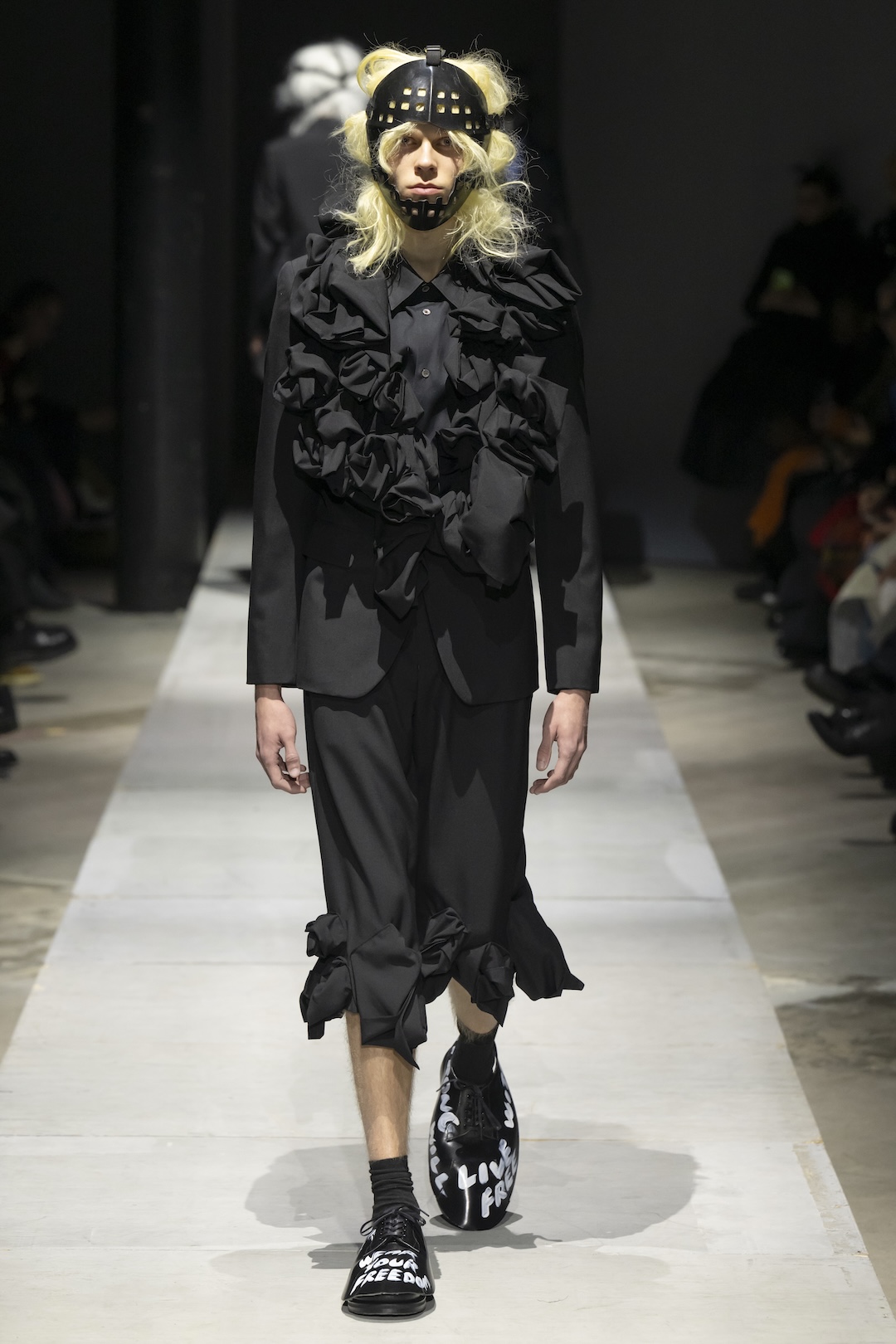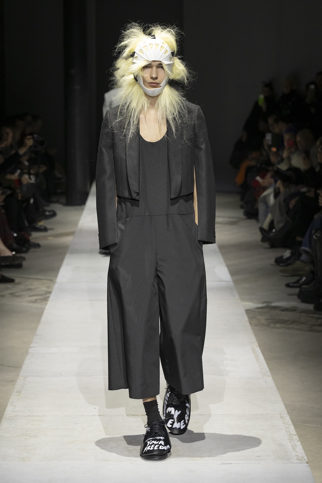Footwear and collaborative projects ground the high-concept aesthetic in contemporary culture. The show highlighted a major collaboration with the Air Jordan 11, alongside specialized footwear developed with Kids Love Gaité. Several looks featured shoes scrawled with handwritten white text, such as “Live Free” and “My Energy,” serving as literal manifestos for the collection’s liberating philosophy. With hair and makeup by Takeo Arai, the presentation stood as a stark, poetic reminder of the strength required to transcend darkness.