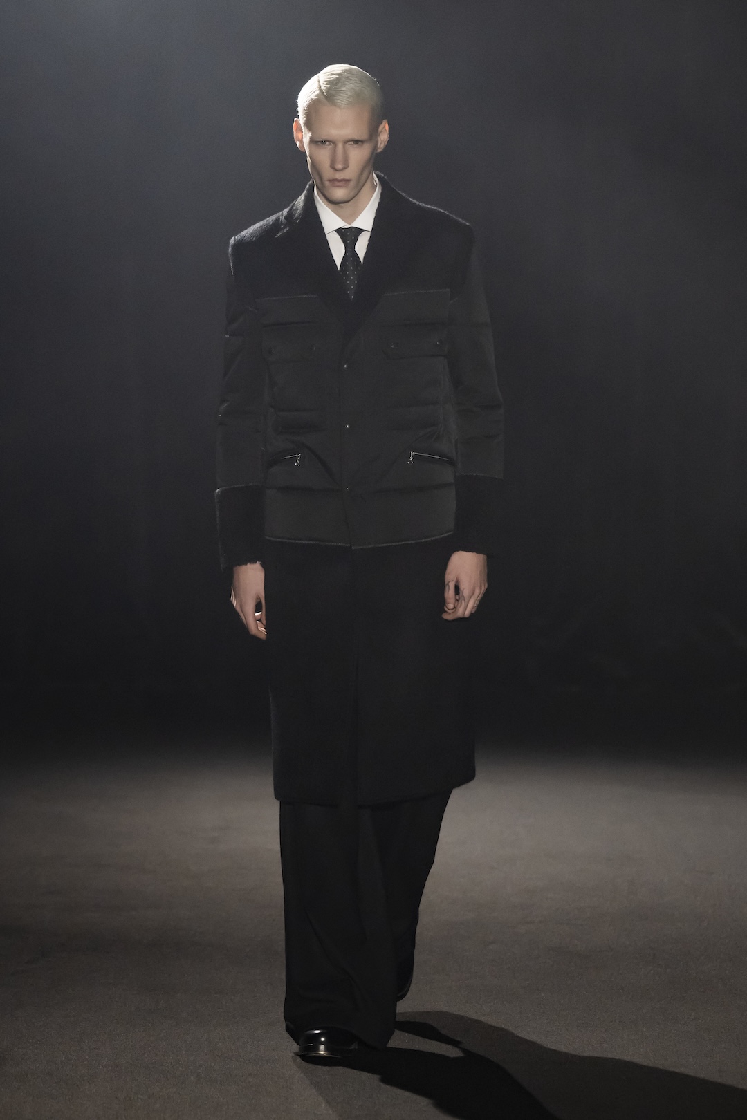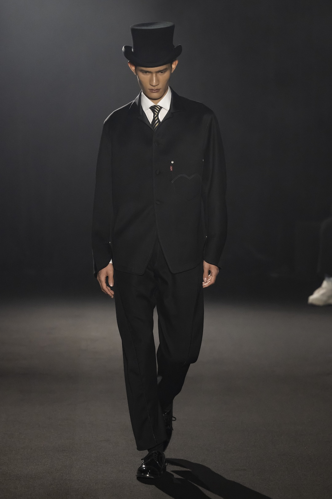 The presentation is anchored by an extensive list of collaborations that merge historical workwear and outdoor archetypes with high-level tailoring. Key projects include a formal wear collaboration with Levi’s and an American traditional wear exploration with Stüssy. The collection also features highly specialized outerwear, such as safety jackets with Spiewak, premium down jackets with Mammut, and a military wear project with Rebuild by Needles.