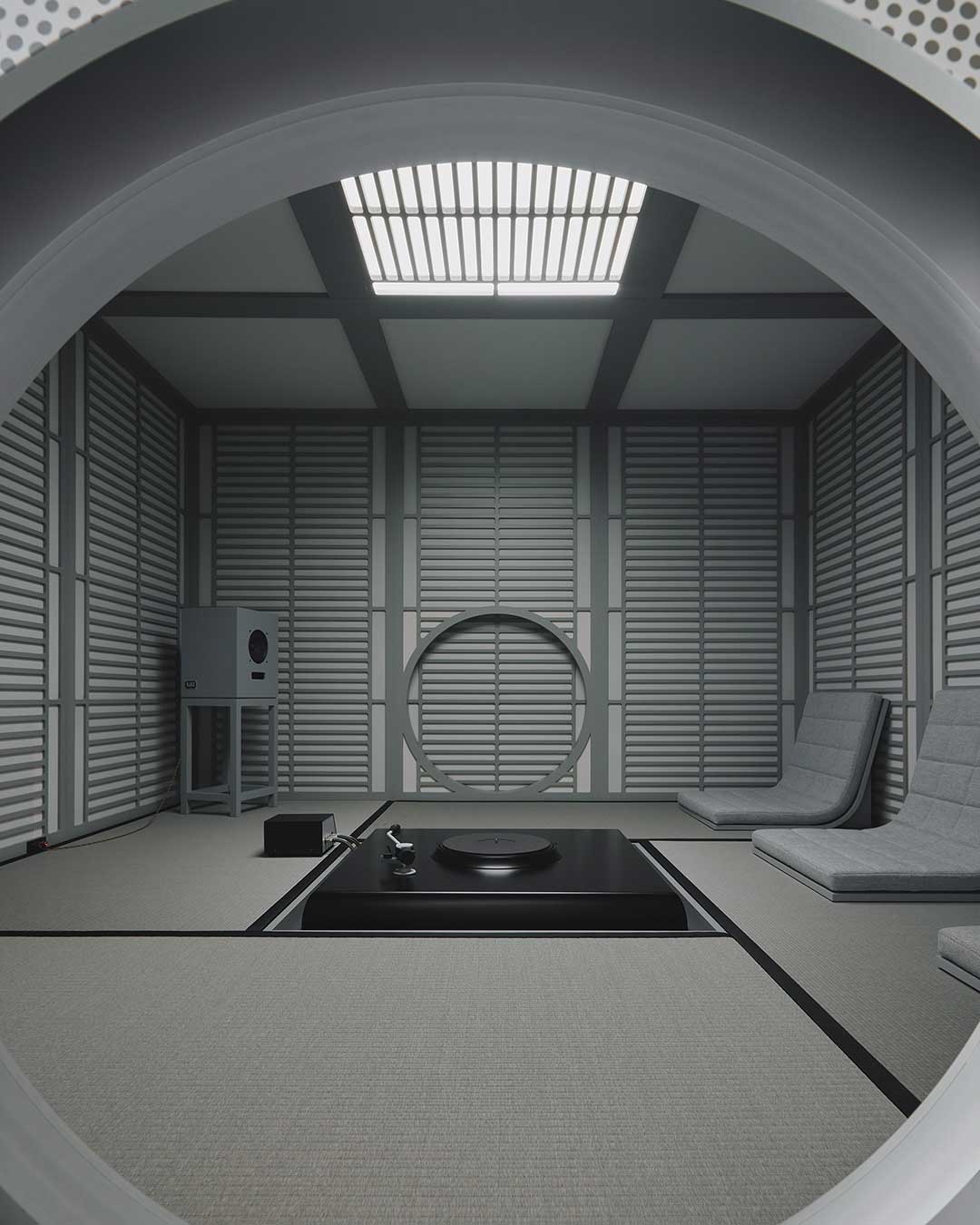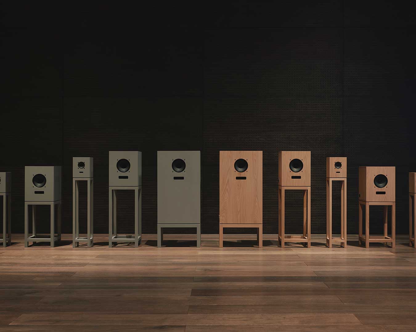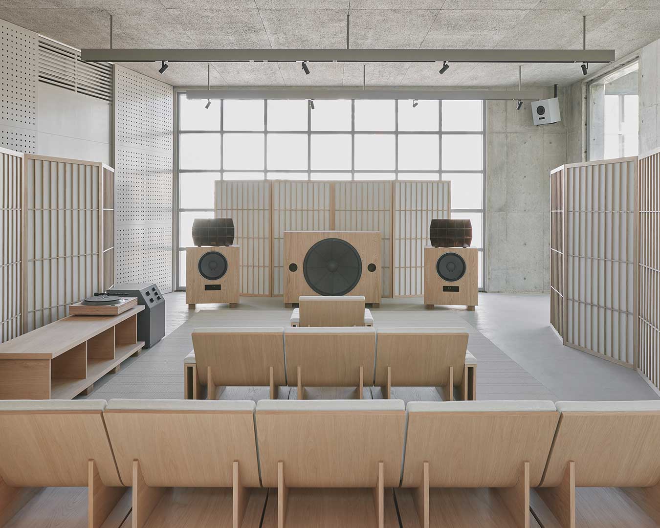 In the basement study, the full product lineup is displayed for closer examination, featuring three primary speaker models: the Sanjo, Rokujo, and Nurikabe. These are presented in two distinct expressions, including Turnbull’s signature Pewter Gray finish—a specialized coating that maintains the visibility of the organic wood grain—and Karimoku’s iconic Pure Oak. Beyond audio equipment, the collection includes modular seating systems and acoustic panels inspired by traditional folding screens or shoji. Accompanied by a curated vinyl selection from the record shop Haru no Ame, the project serves as a study of form that goes beyond mere functionality, aiming to stir the emotions of the user and bring an enriching rhythm to everyday life through the resonance of material and craft.