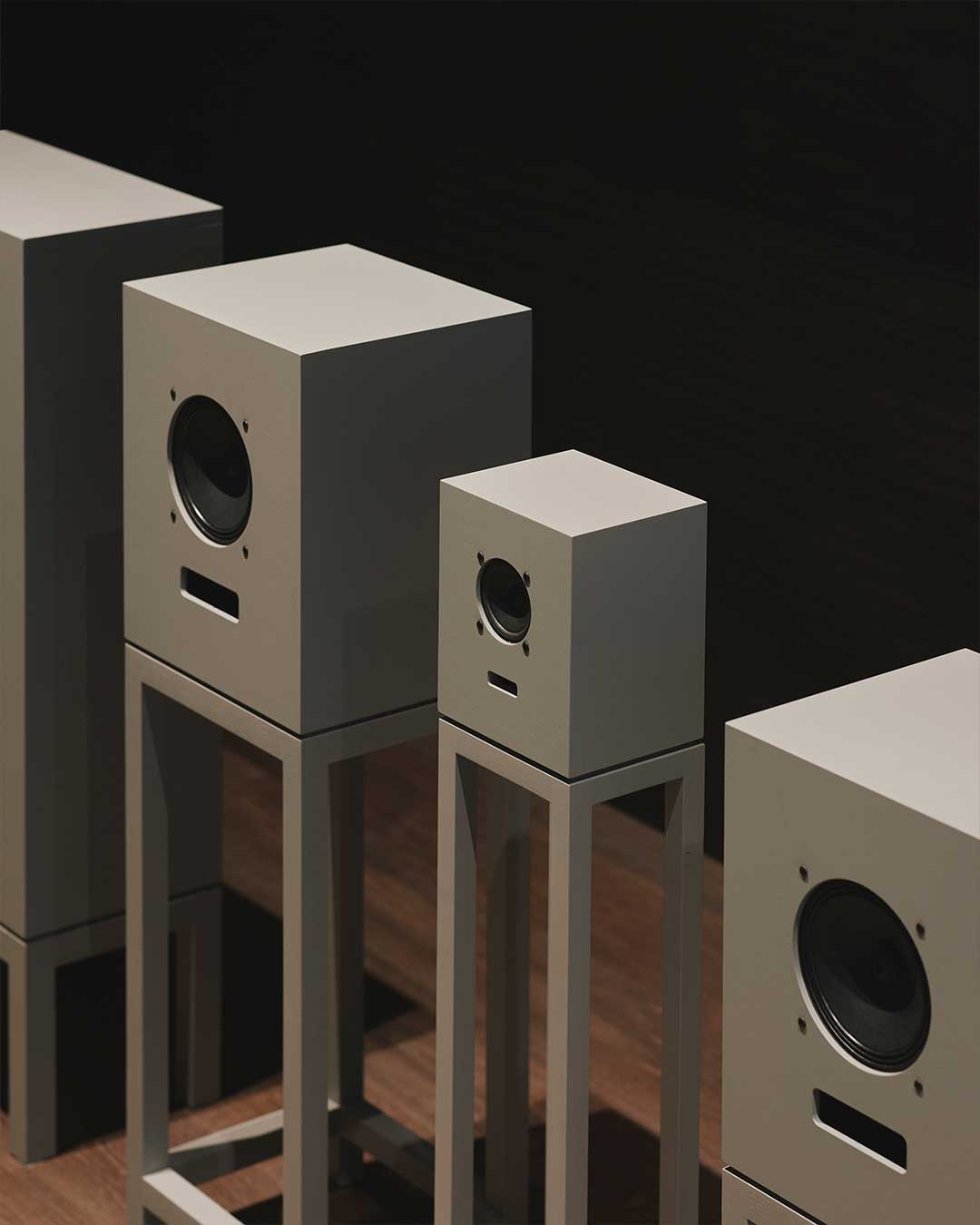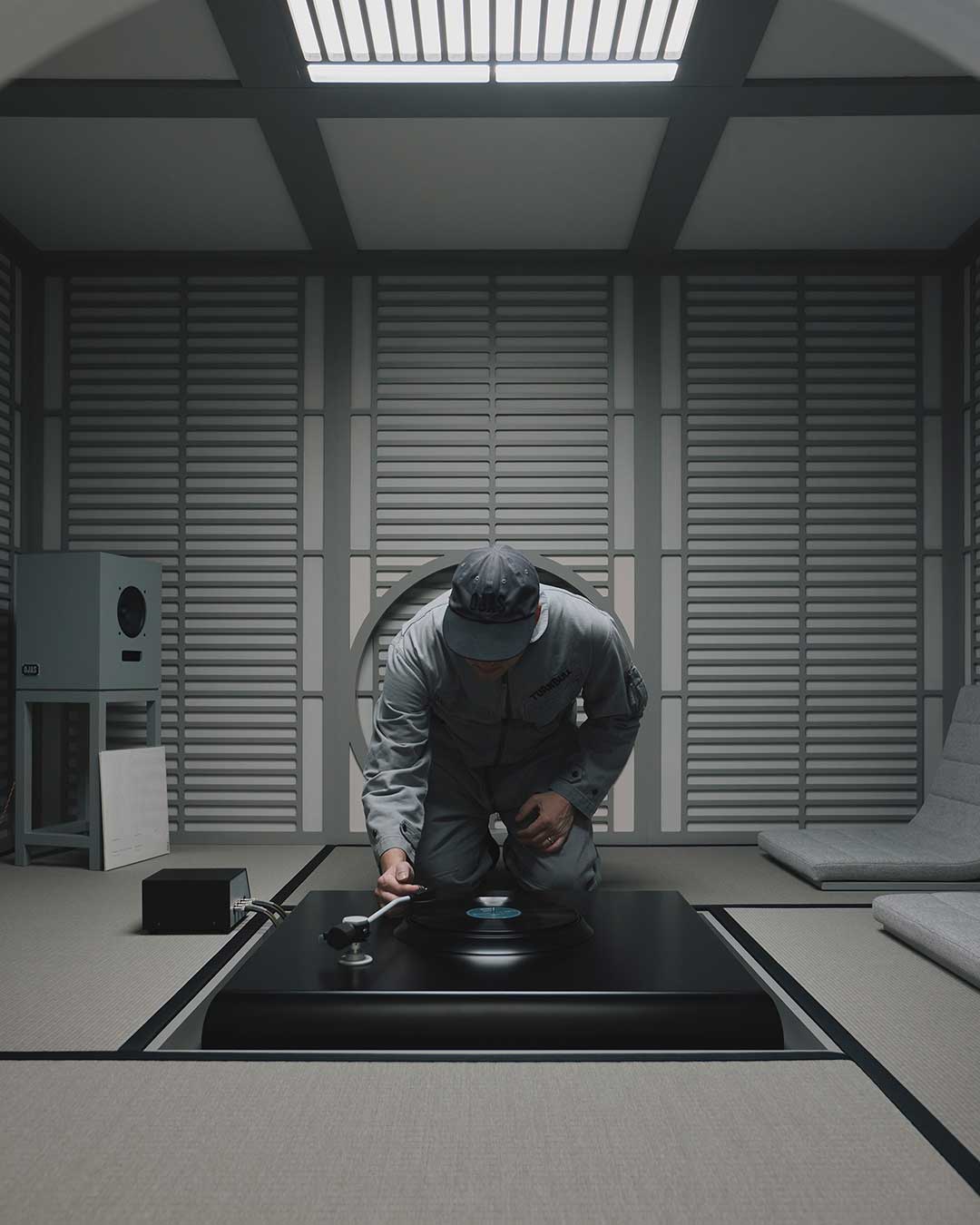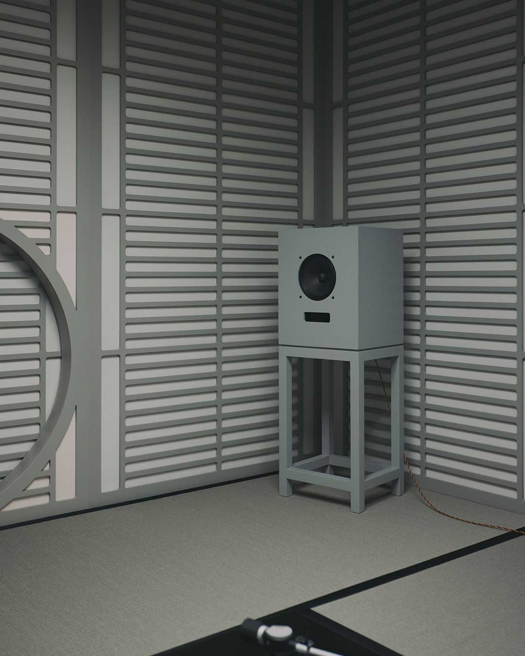In the basement study, the full product lineup is displayed for closer examination, featuring three primary speaker models: the Sanjo, Rokujo, and Nurikabe. These are presented in two distinct expressions, including Turnbull’s signature Pewter Gray finish—a specialized coating that maintains the visibility of the organic wood grain—and Karimoku’s iconic Pure Oak. Beyond audio equipment, the collection includes modular seating systems and acoustic panels inspired by traditional folding screens or shoji. Accompanied by a curated vinyl selection from the record shop Haru no Ame, the project serves as a study of form that goes beyond mere functionality, aiming to stir the emotions of the user and bring an enriching rhythm to everyday life through the resonance of material and craft.