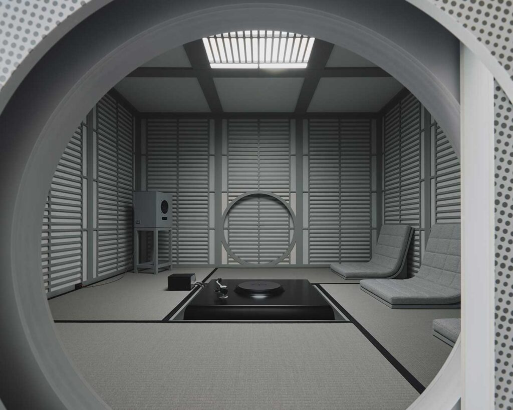 The exhibition is meticulously structured across three floors to provide a multifaceted sensory experience. On the first floor, visitors encounter a Sound House inspired by a traditional Japanese tea room, wrapped in an intricate dot pattern and designed as a meditative retreat that shuts out external noise to focus on sonic purity. At its center stands a single pair of Rokujo speakers, inviting guests to settle into a single chair and confront the particles of sound and the intervals of silence. The second floor opens into an expansive public listening room centered around a massive speaker system featuring multicell horn speakers produced using Karimoku Furniture’s advanced precision technology. These emblematic pieces are guided by decades of craft, with wood grain and grain direction carefully selected to materialize the organic resonance and depth of natural wood.